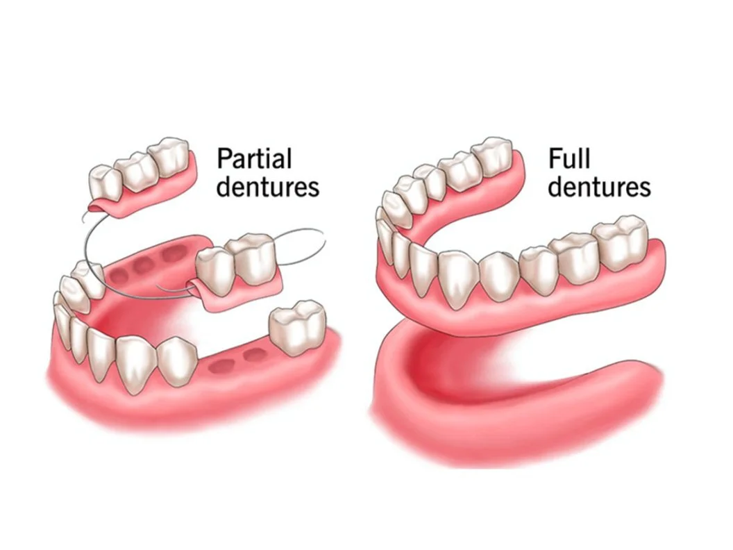 There are two main types of dentures: complete and partial. Both are removable dental appliances custom-designed to replace missing teeth and the surrounding tissue. Complete dentures are used when all teeth are missing, while partial dentures are utilized when some natural teeth remain. Partial dentures fill in the gaps left by missing teeth and also help prevent the remaining teeth from shifting.